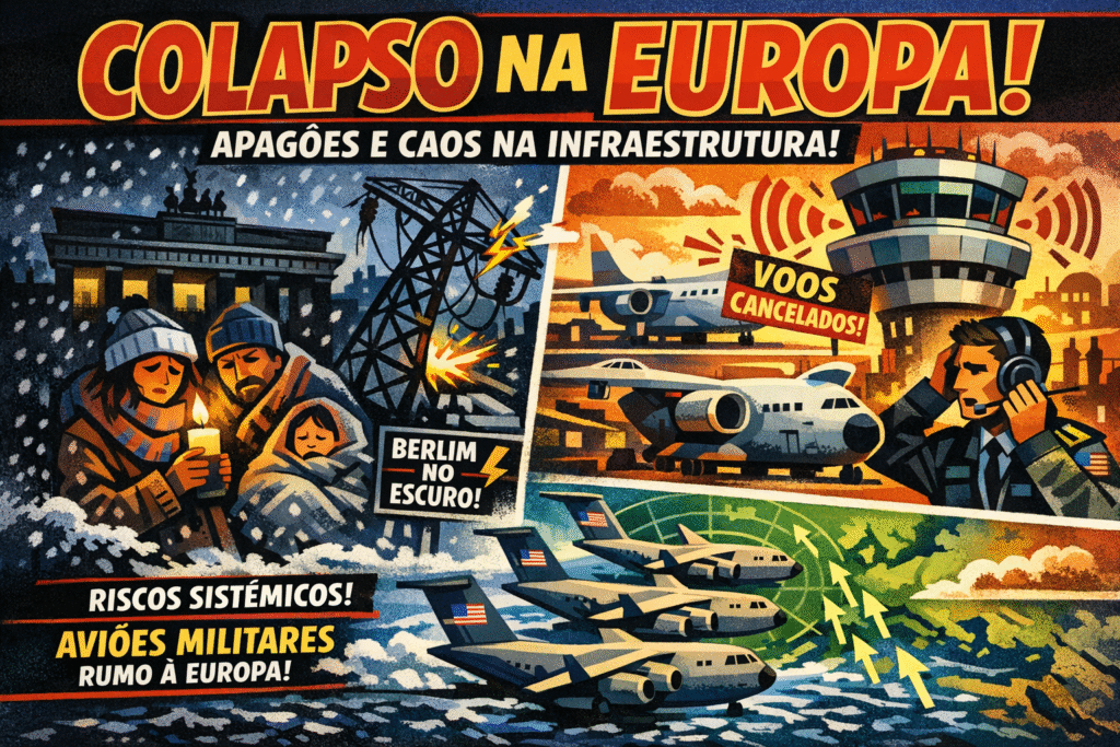 Uma série de eventos simultâneos vem gerando questionamentos sobre a segurança de infraestrutura na Europa: 45.000 residências ficaram sem energia em Berlim desde sábado pela manhã, em meio ao inverno rigoroso. Ao mesmo tempo, todos os voos na Grécia foram suspensos após um colapso nas frequências de rádio que paralisou a comunicação do tráfego aéreo. Enquanto isso, múltiplos aviões militares americanos C-17 são reportados cruzando o Atlântico em direção à Europa, transportando equipamento militar não especificado. Nota editorial: Este conteúdo tem caráter analítico e opinativo, baseado em informações públicas e reportagens amplamente divulgadas (com links para as fontes). Não afirma